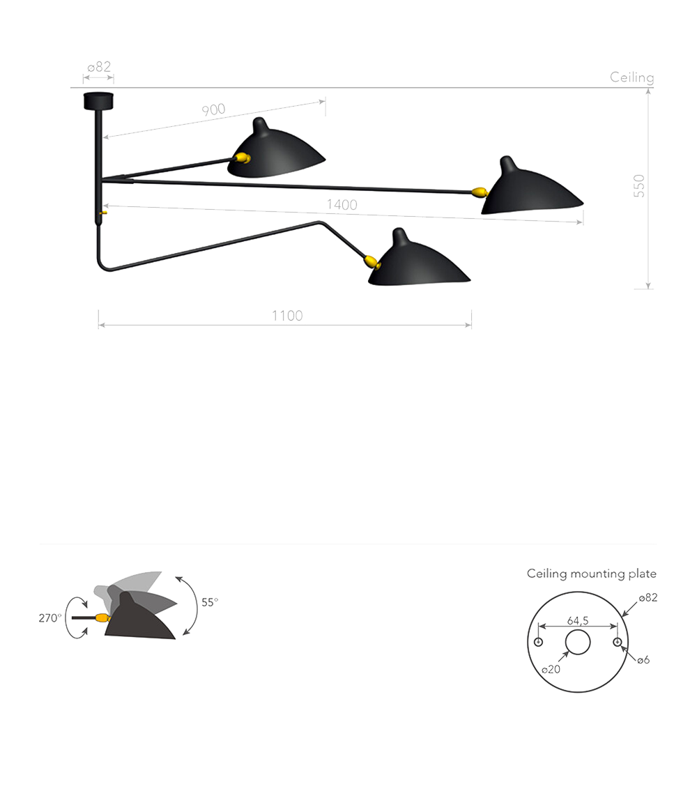 CEILING LAMP 2 FIXED ARMS 1 ROTATING CURVED ARM (씨링 램프 2 픽스드 암스 1 로테이팅 커브드 암)