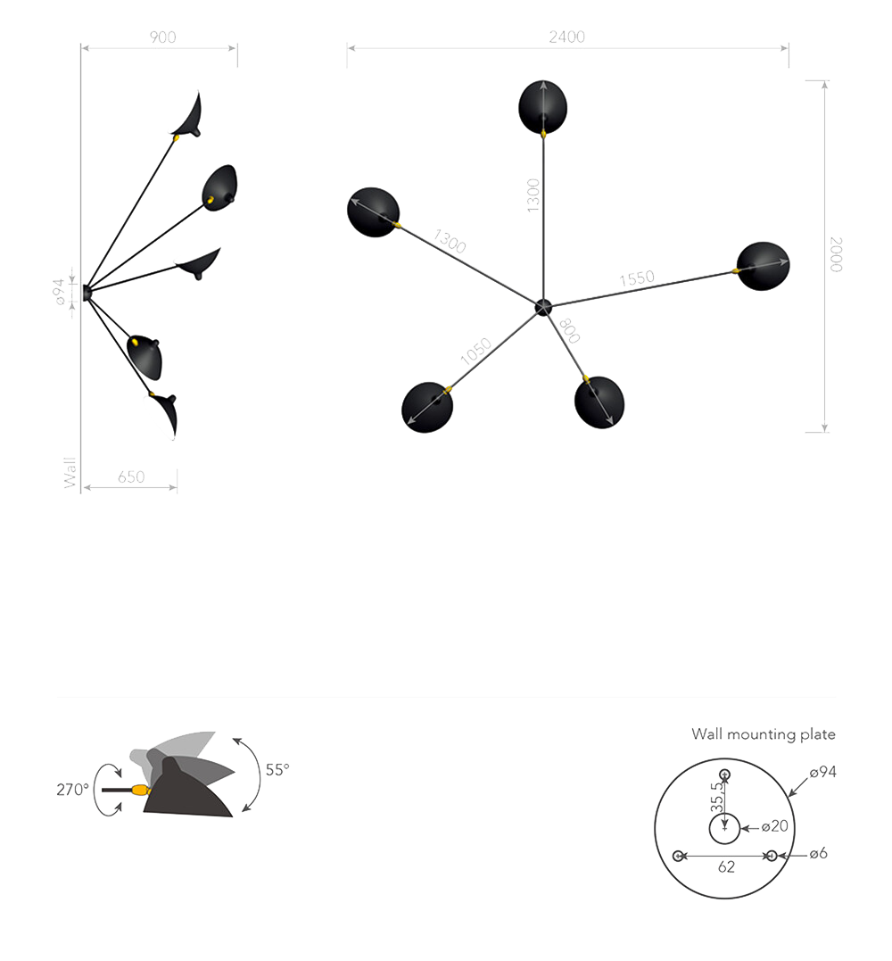 다섯 개의 암은 세르주 무이가 계산한 완벽한 균형으로 고정되어, 마치 하나의 벽 조각 작품처럼 공간에 입체적인 긴장감을 더합니다. 유기적 실루엣의 ‘물(Moule)’과 기능적 ‘꺄스켓(Casquette)’ 리플렉터를공간과 분위기에 따라 선택할 수 있어, 섬세한 뉘앙스 연출도 가능합니다.