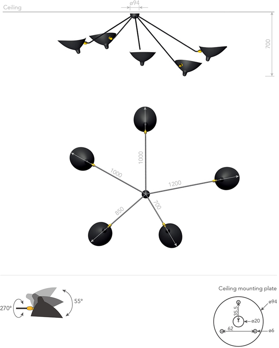 화려한 장식을 배제하고 절제된 선과 기하학적인 형태로 이루어진 다섯 개의 고정된 팔은 천장에 모던한 리듬감을 선사합니다.