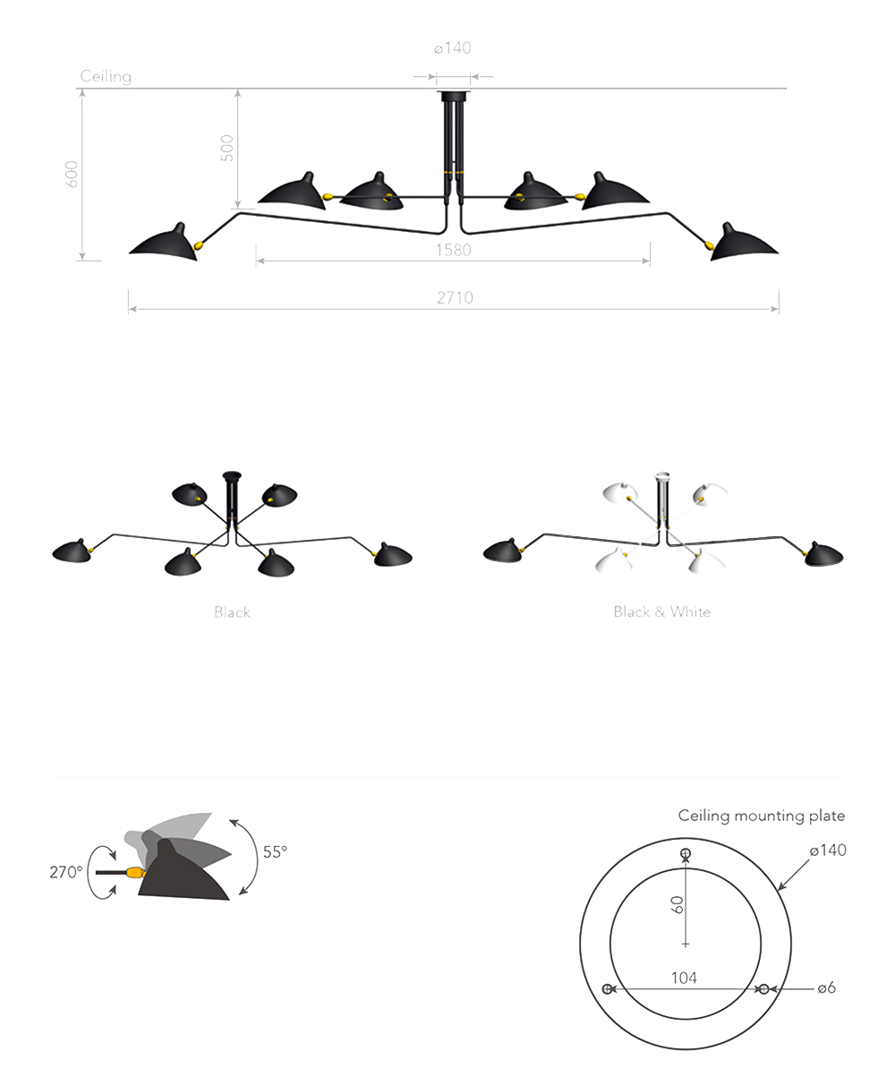 넓은 공간의 다양한 조명 니즈를 하나의 조명으로 해결하기 위해 고안된, 가장 지능적인 솔루션 중 하나입니다. 길이가 다른 여섯 개의 팔은 각각 독립적으로 회전하여, 공간의 기능에 따라 빛을 자유롭게 더하거나 뺄 수 있는 최고의 유연성을 제공합니다.