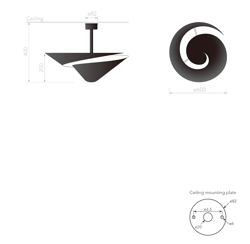 달팽이 껍질을 닮은 유기적인 형태의 쉐이드는 빛을 위쪽으로 부드럽게 반사시켜, 눈부심 없이 공간 전체를 편안한 빛으로 가득 채웁니다. 하나 또는 여러 개를 함께 사용하여 천장에 빛과 그림자로 패턴을 만들 수 있으며, 특히 휴식이 필요한 침실이나 부드러운 분위기가 중요한 다이닝 공간에 가장 적합합니다.