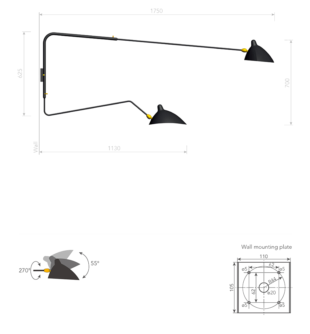 WALL LAMP 2 ROTATING ARMS, 1 STRAIGHT, 1 CURVED (월 램프 2 로테이팅 암스, 1 스트레이트, 1 커브드)